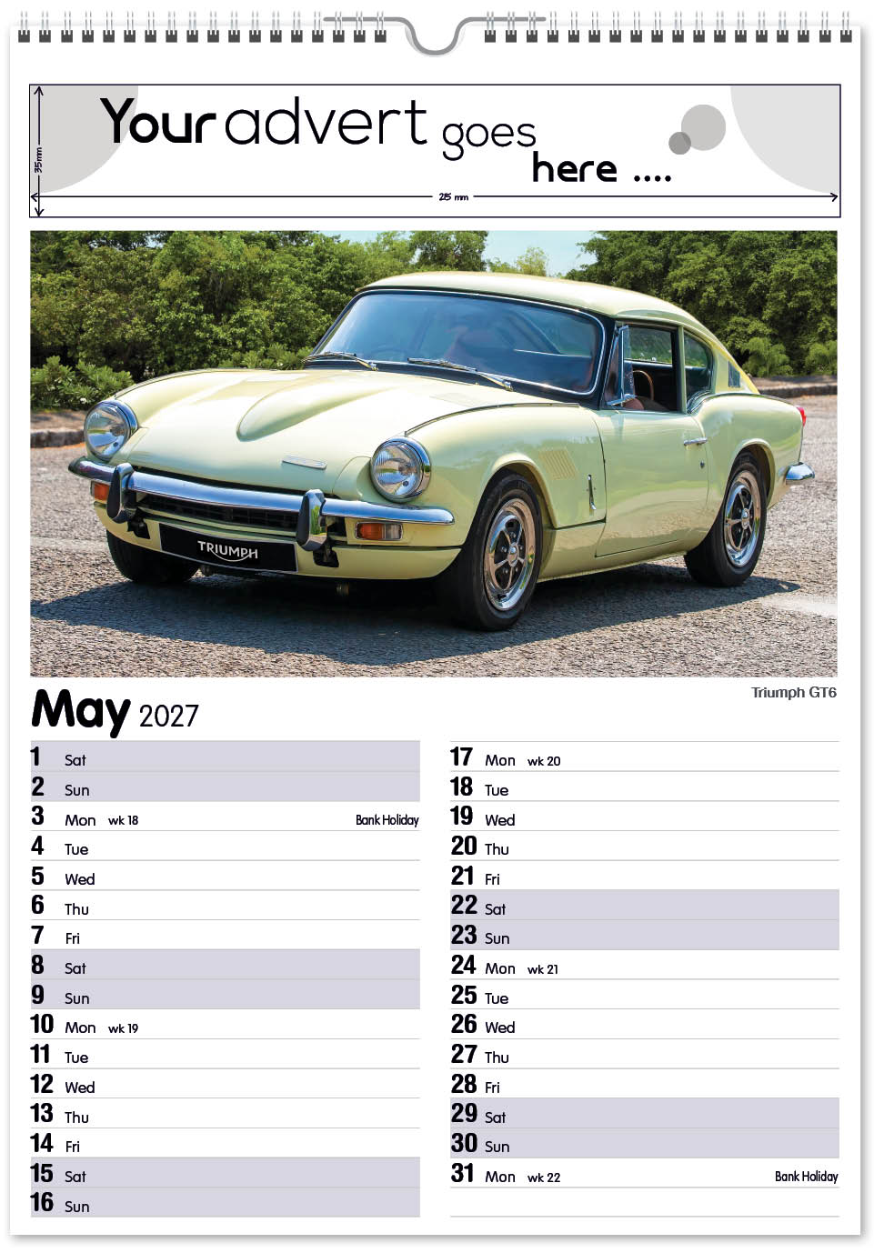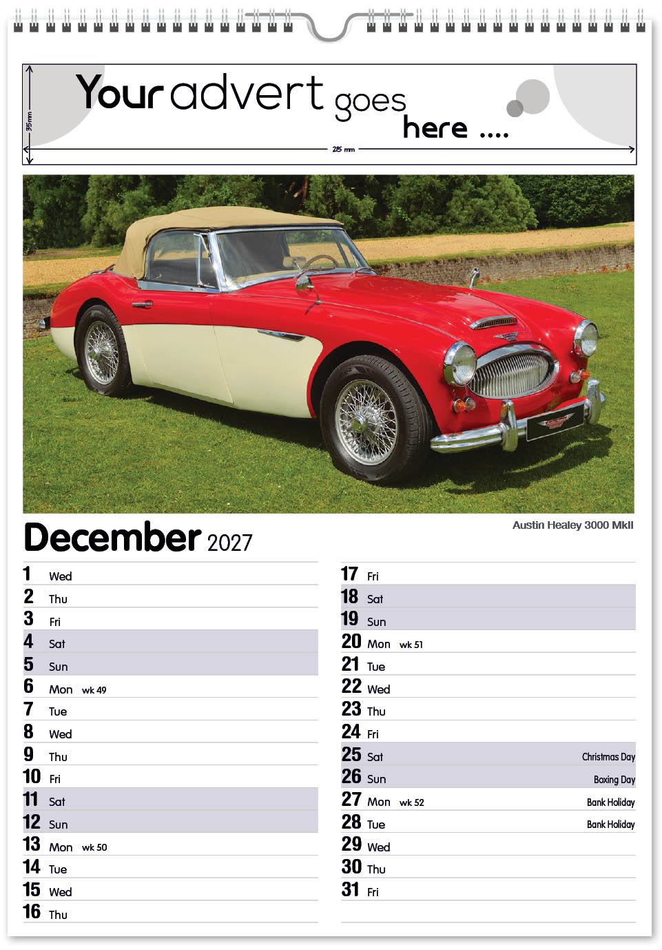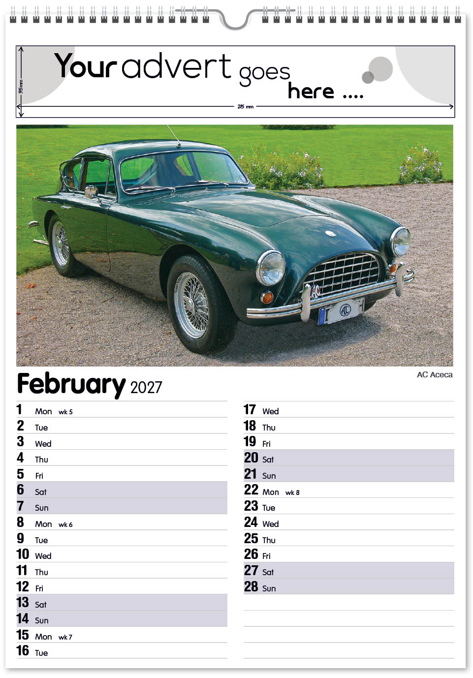 Each calendar comes with an advert section. It is this section that we replace with your personalised company advert that either we design for you, or you supply to us. This section can be seen on our range’s images titled “Your advert goes here”.