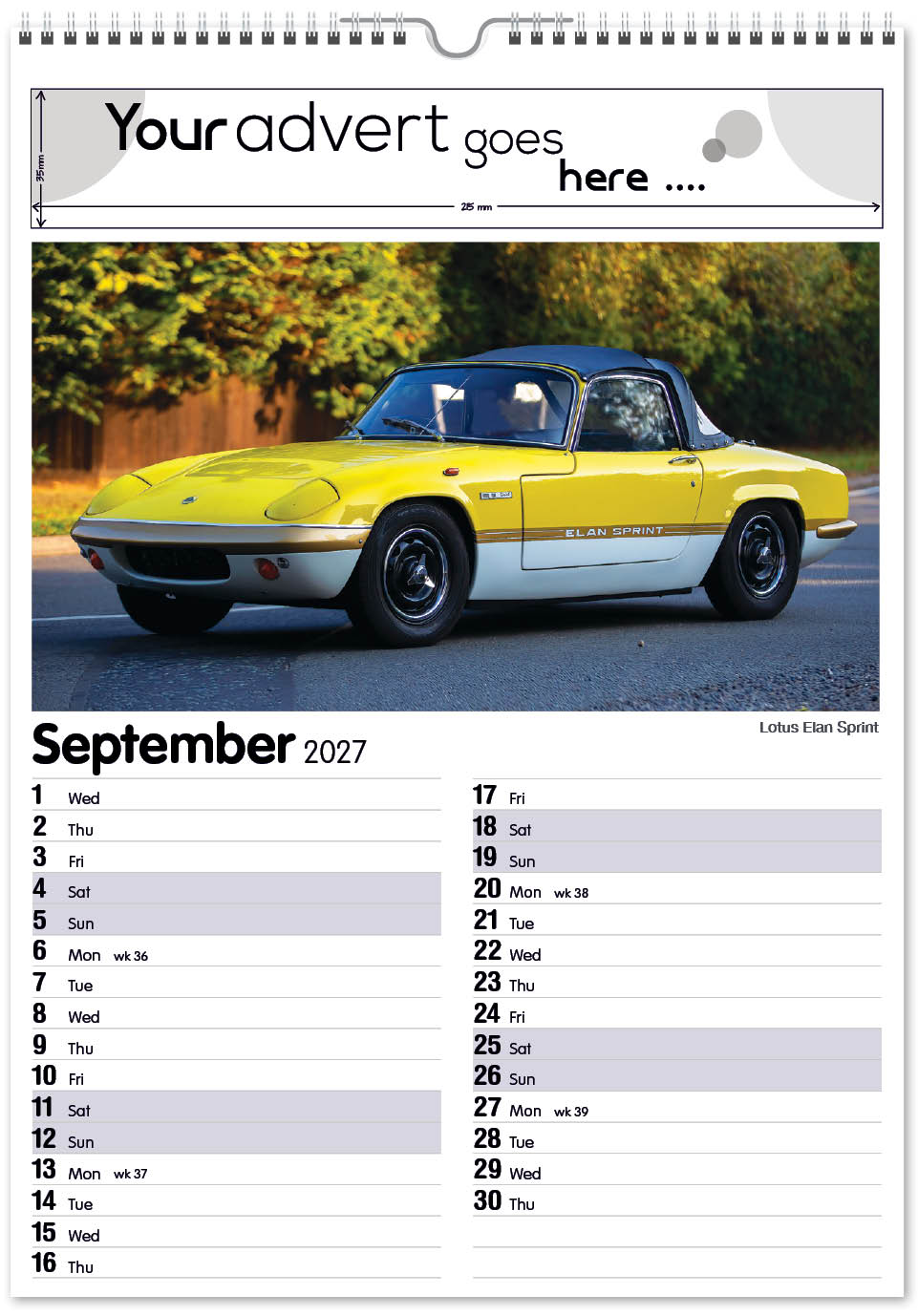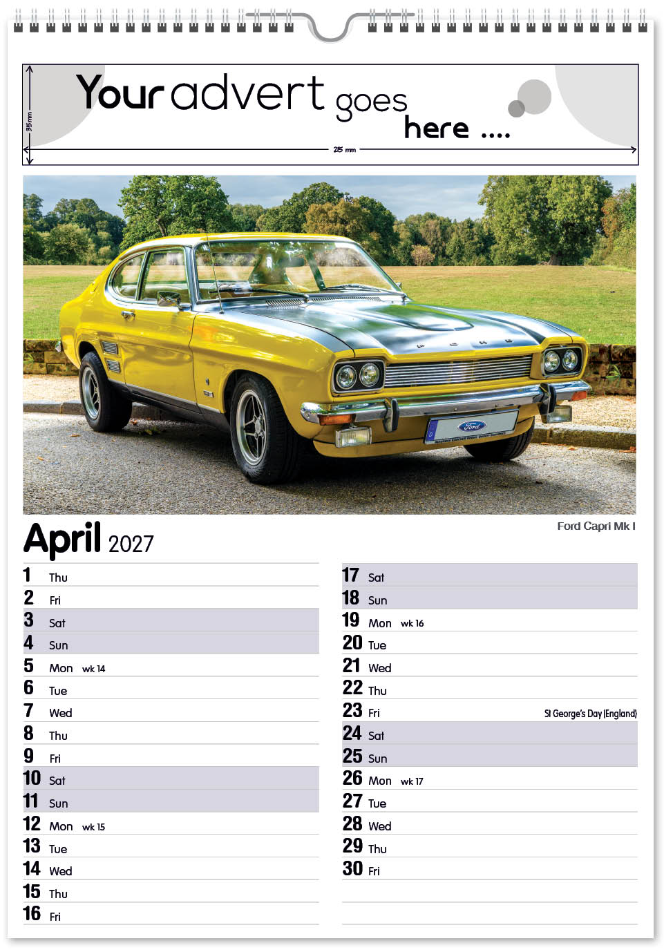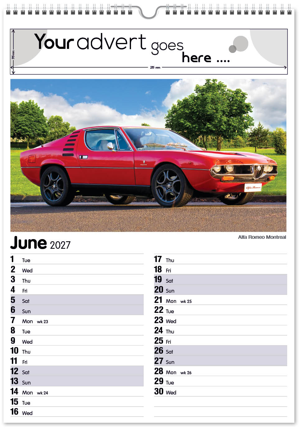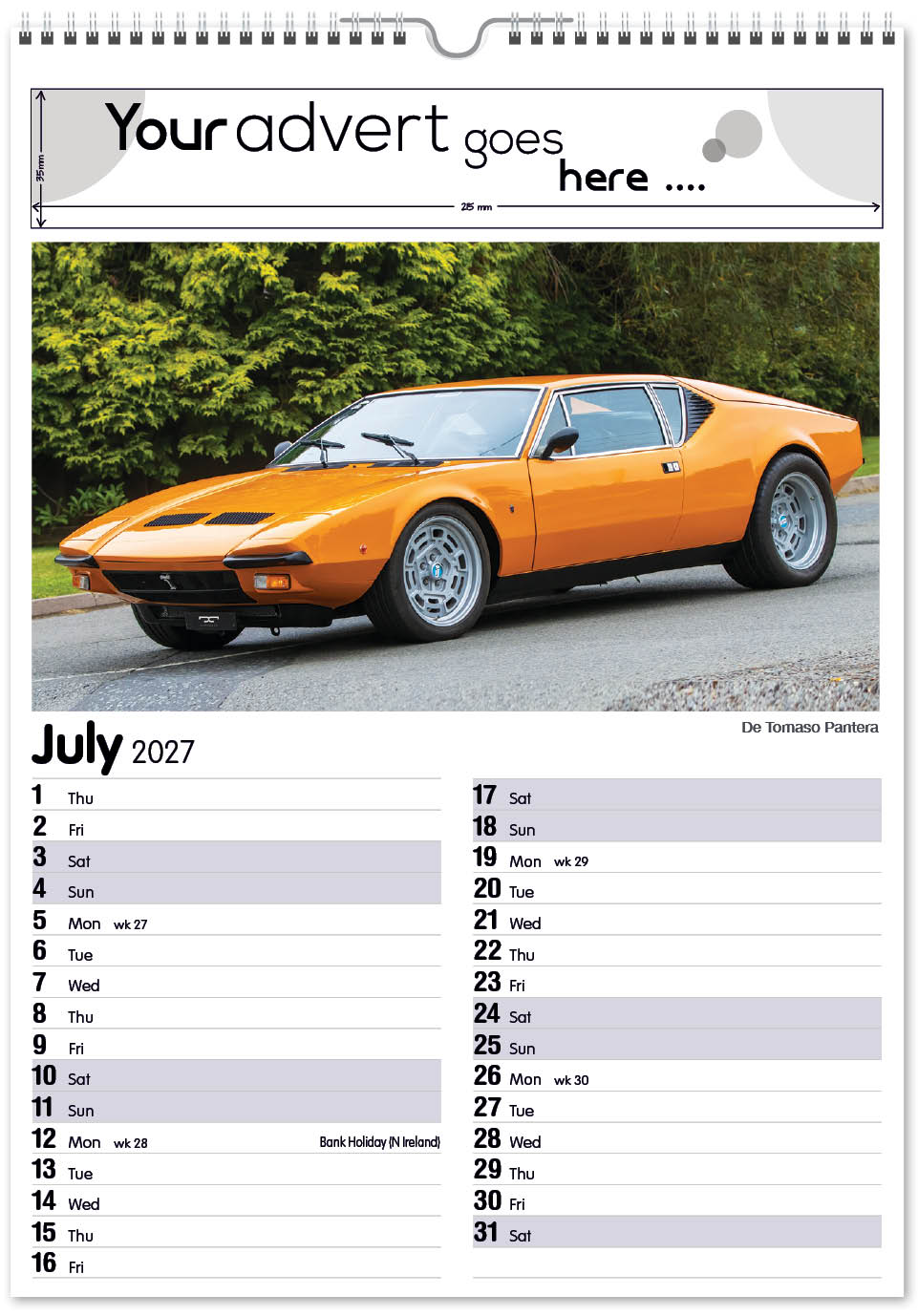 Each calendar comes with an advert section. It is this section that we replace with your personalised company advert that either we design for you, or you supply to us. This section can be seen on our range’s images titled “Your advert goes here”.