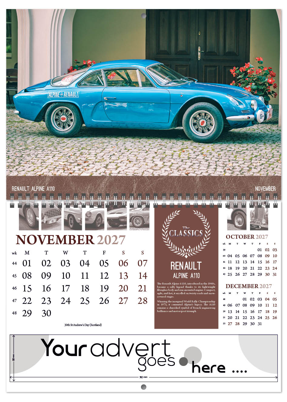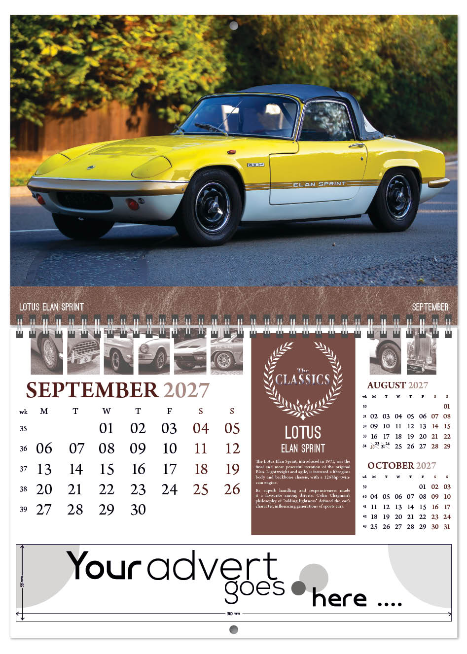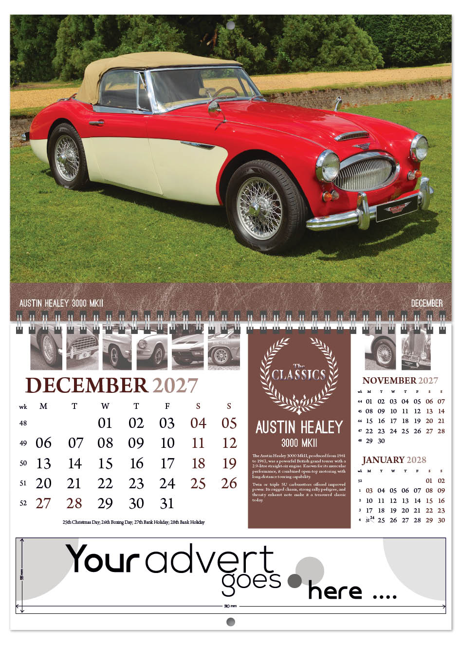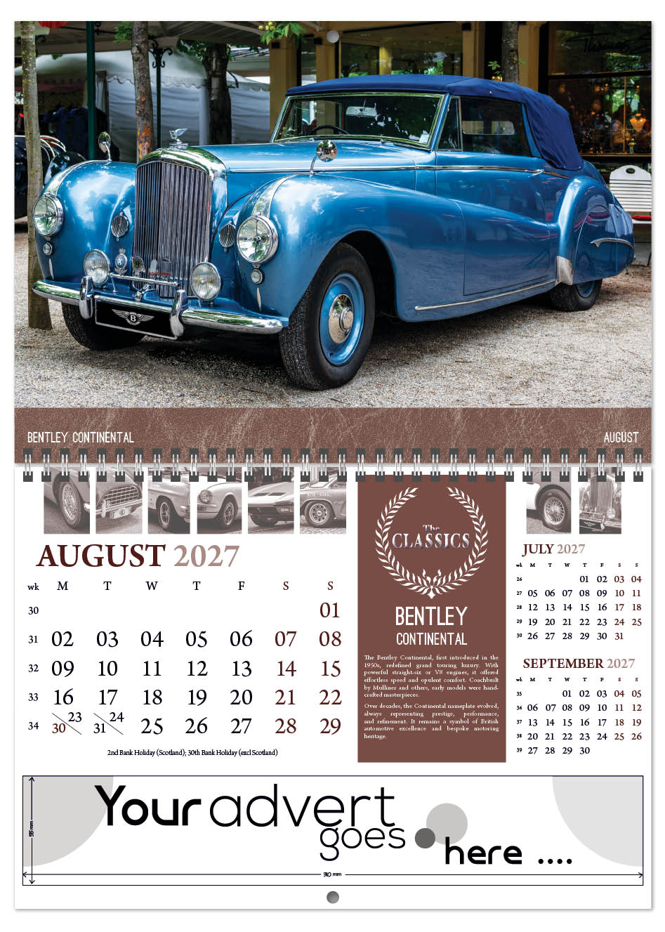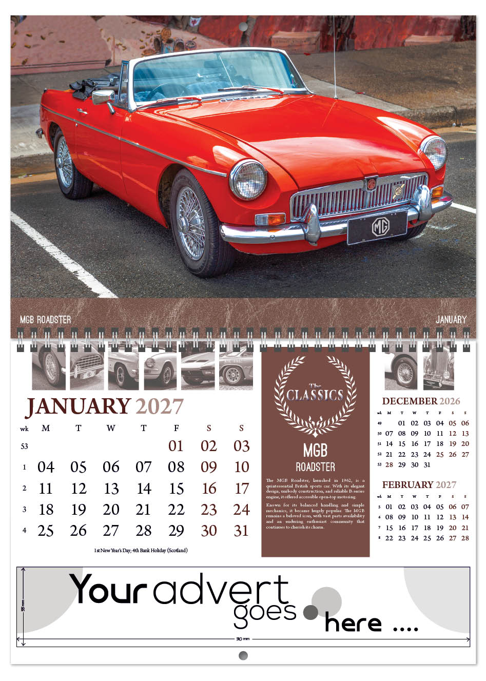 Each calendar comes with an advert section. It is this section that we replace with your personalised company advert that either we design for you, or you supply to us. This section can be seen on our range’s images titled “Your advert goes here”.