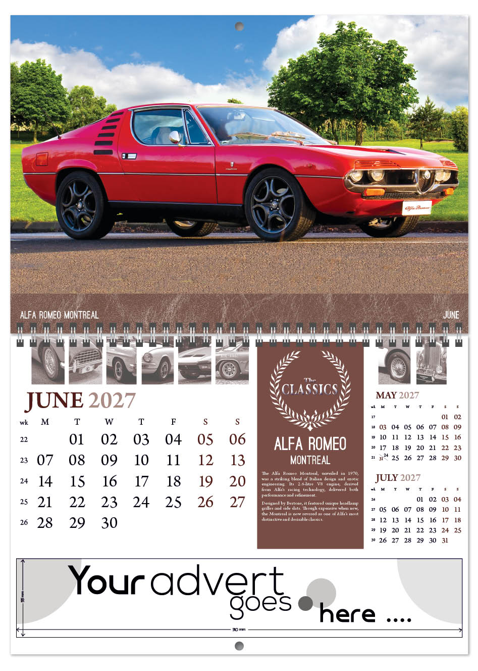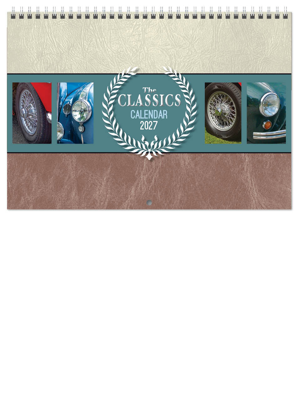 Our Deluxe Central Wiro range of calendars is designed to save you postage whilst still having a premium varnished calendar. When folded they fit into a Royal Mail ‘Large letter’ sized envelope so the saving on postage is substantial. Stunning Images of vintage classic cars from the past are showcased in The Classics Deluxe Central Wired Wall calendar. Motor enthusiasts will love the images of the golden era of car manufacturing. Each page features informative descriptions.