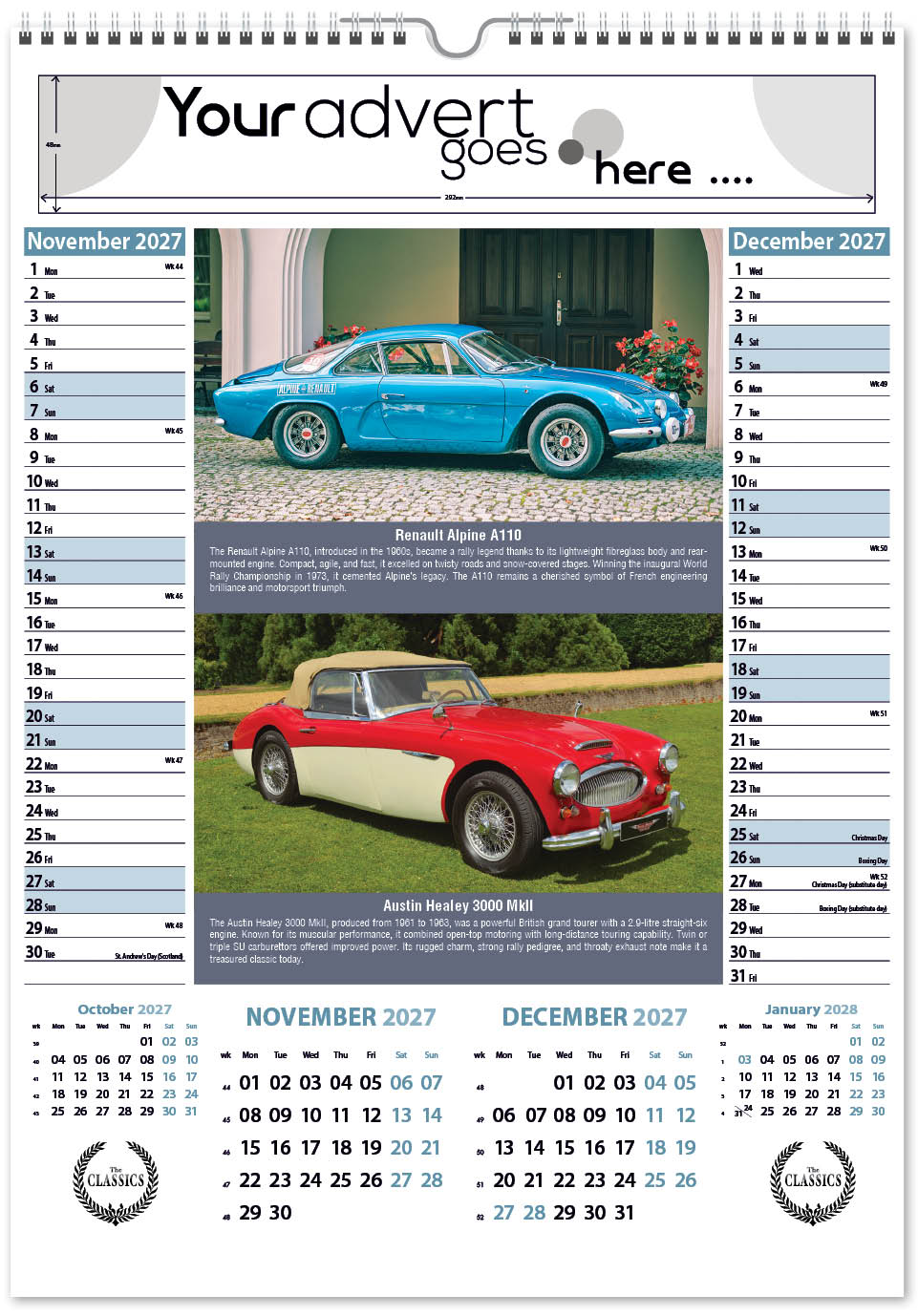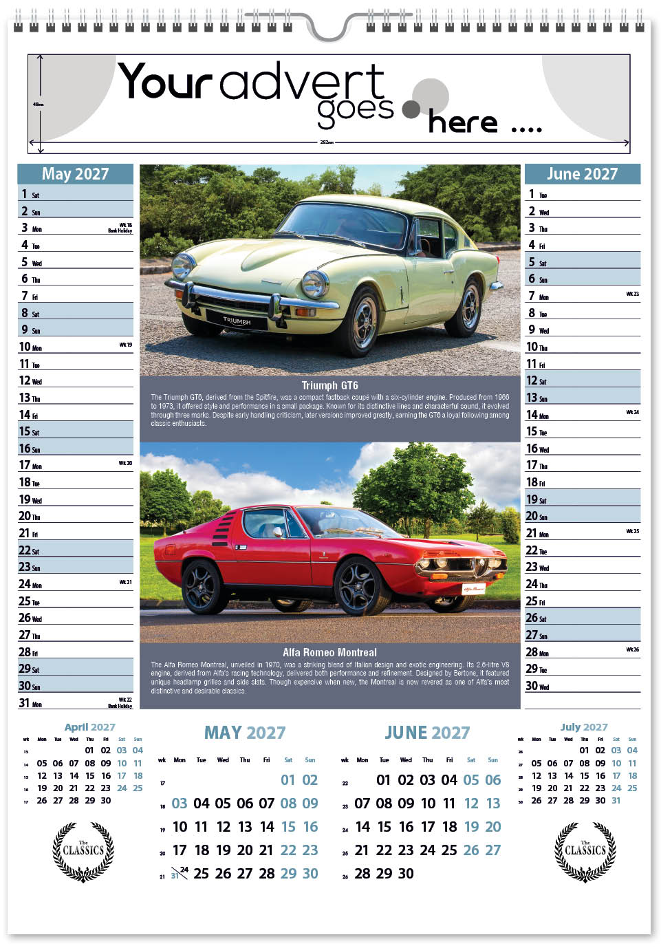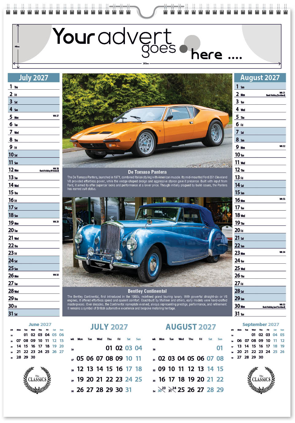 Each calendar comes with an advert section. It is this section that we replace with your personalised company advert that either we design for you, or you supply to us. This section can be seen on our range’s images titled “Your advert goes here”.