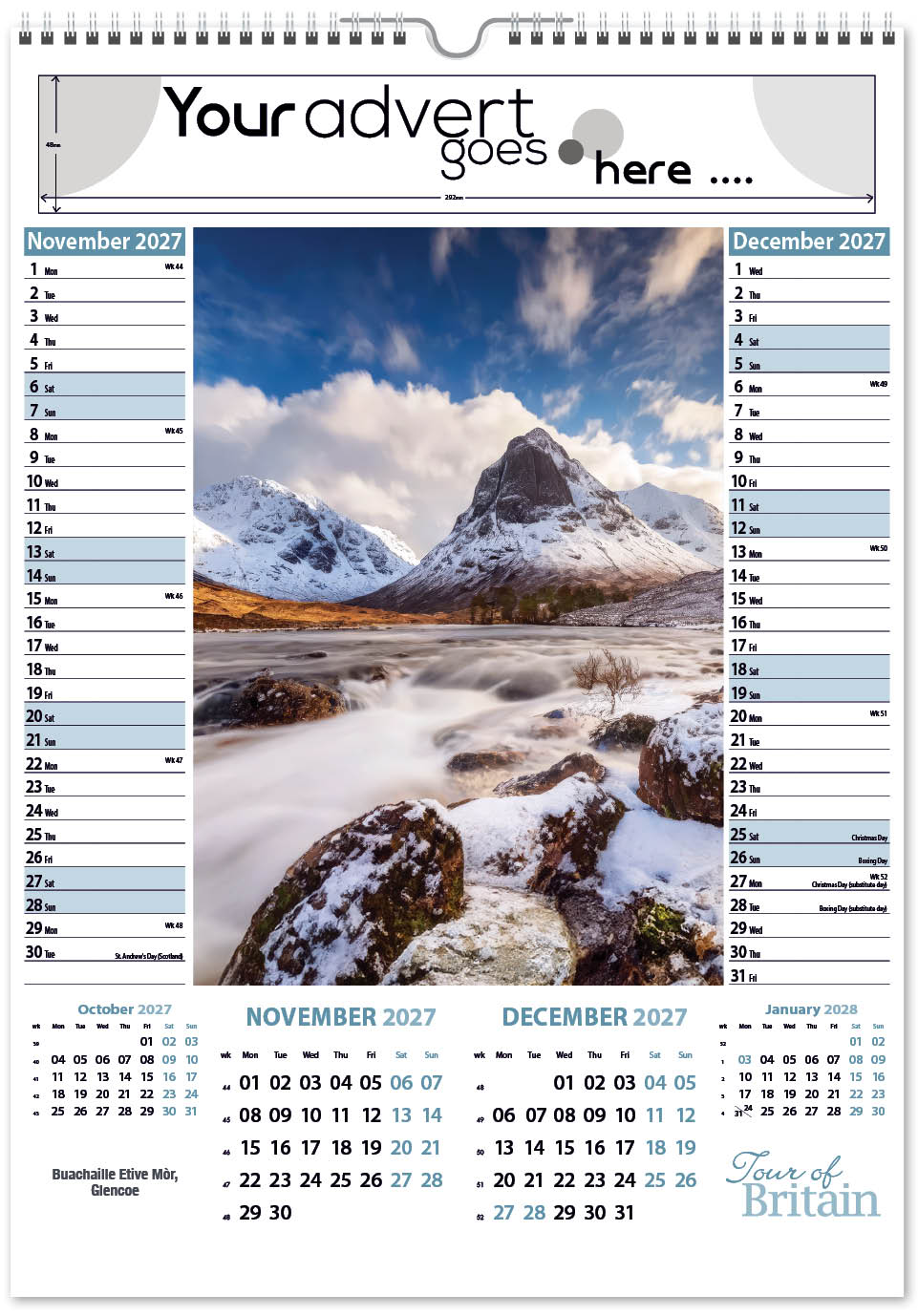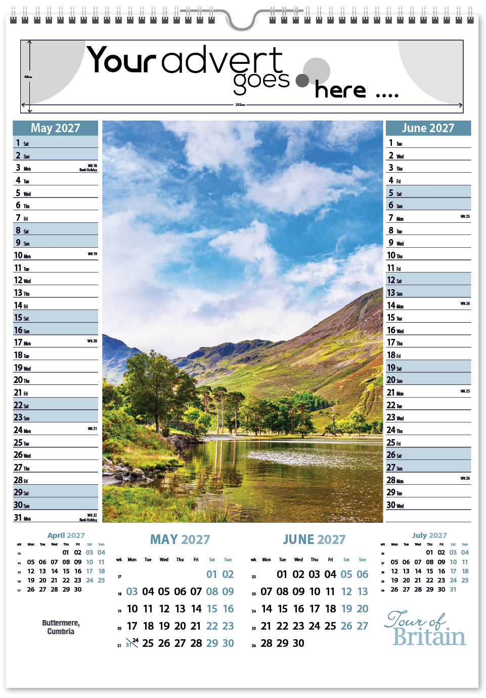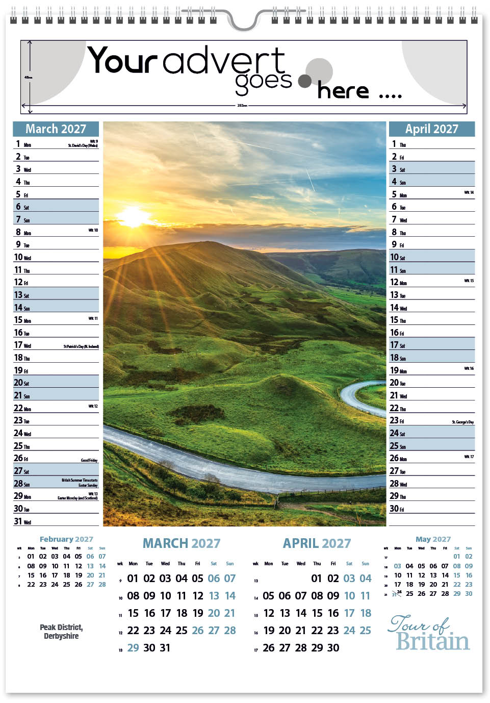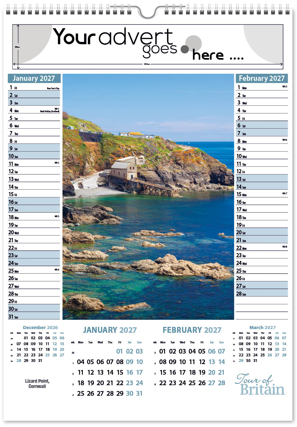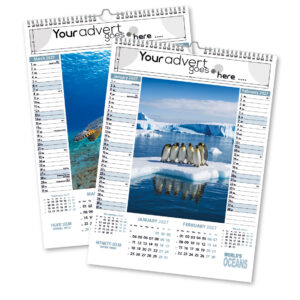 Each calendar comes with an advert section. It is this section that we replace with your personalised company advert that either we design for you, or you supply to us. This section can be seen on our range’s images titled “Your advert goes here”.