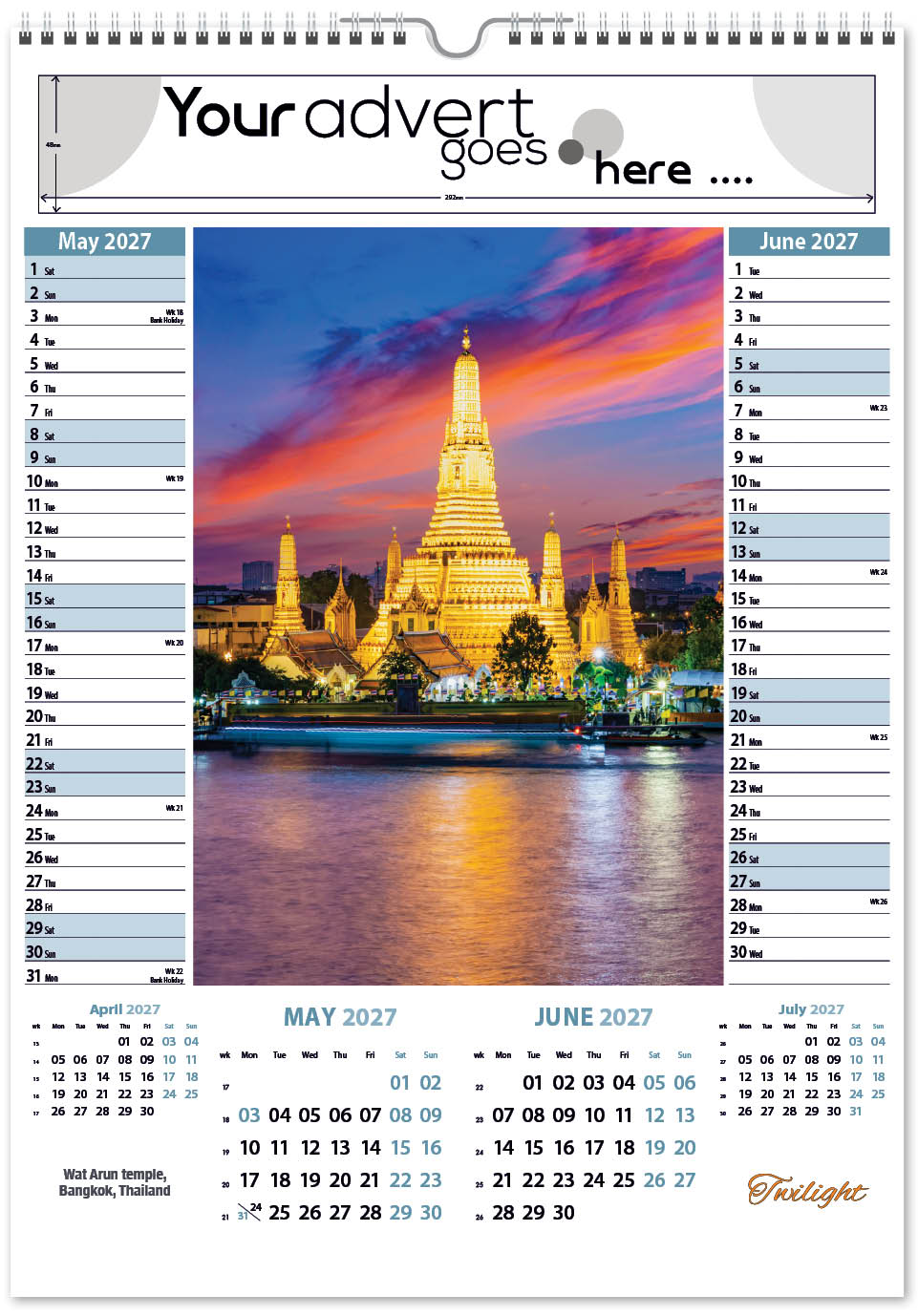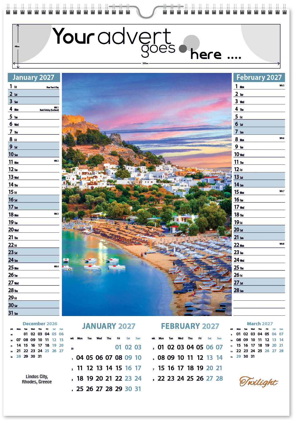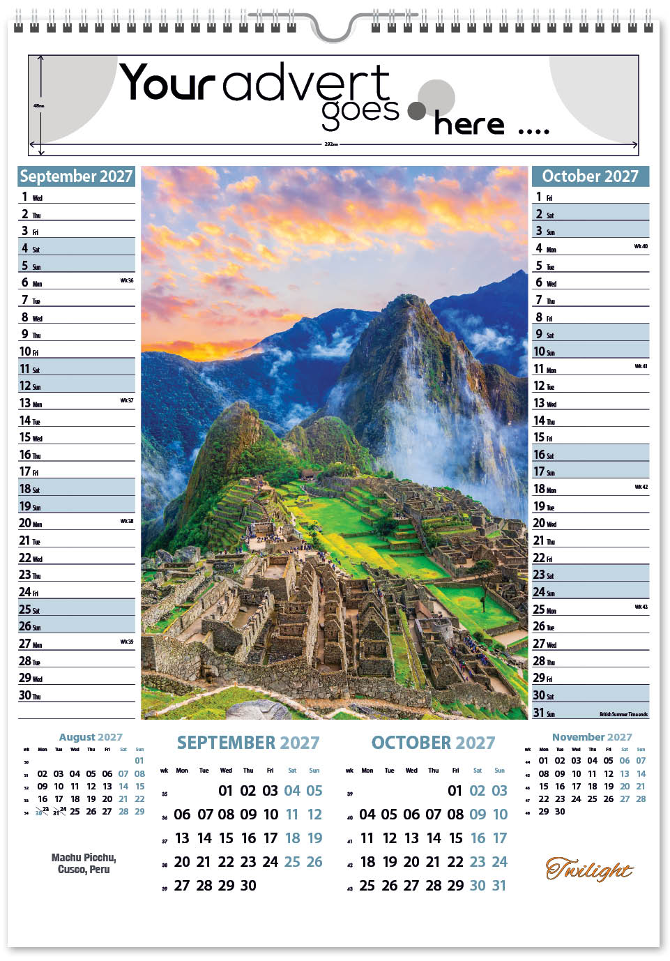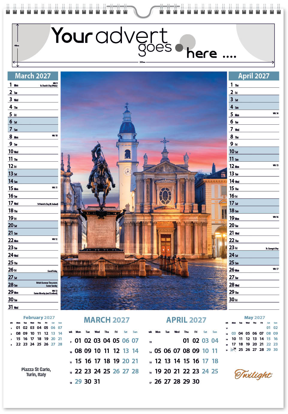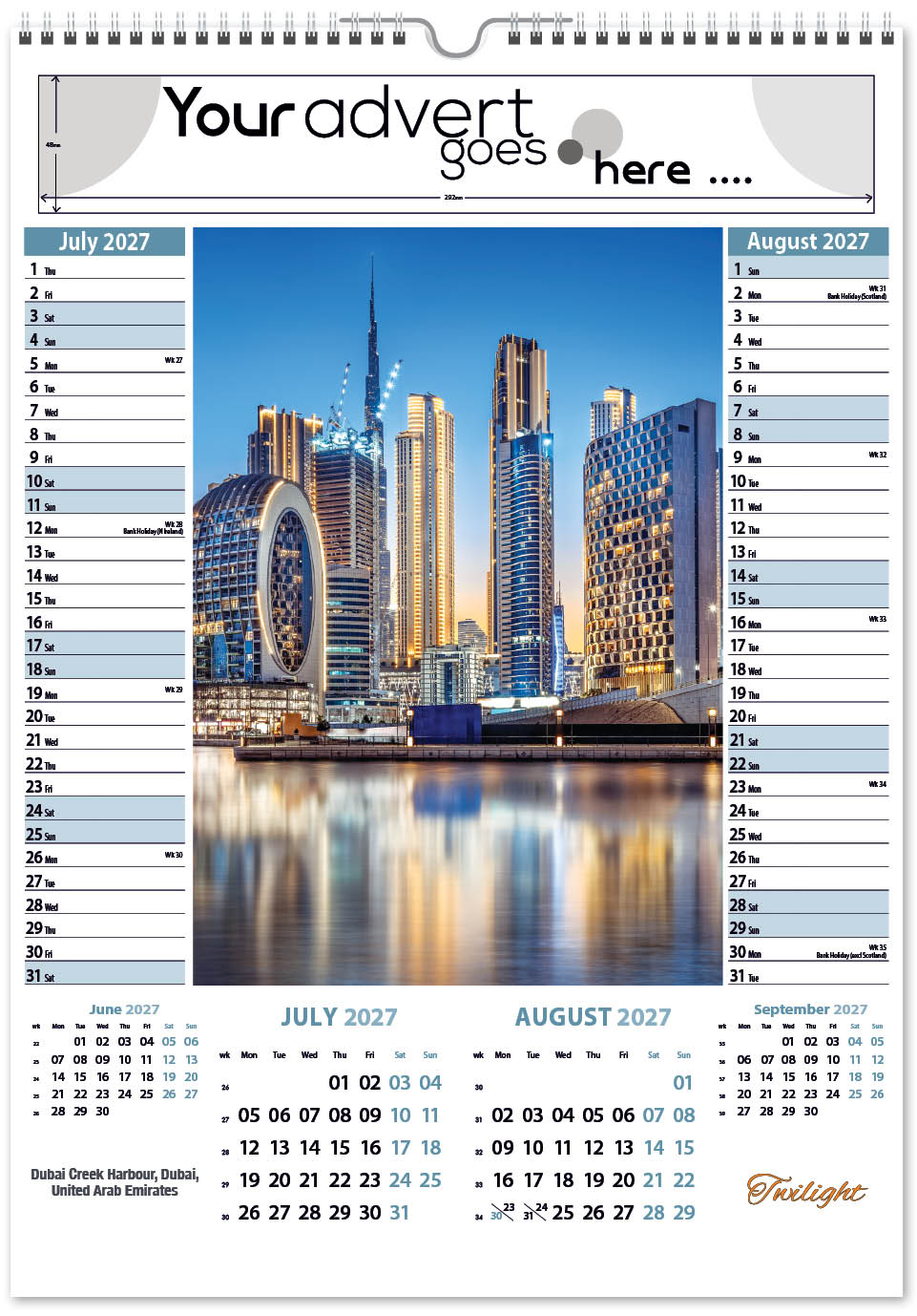 Each calendar comes with an advert section. It is this section that we replace with your personalised company advert that either we design for you, or you supply to us. This section can be seen on our range’s images titled “Your advert goes here”.