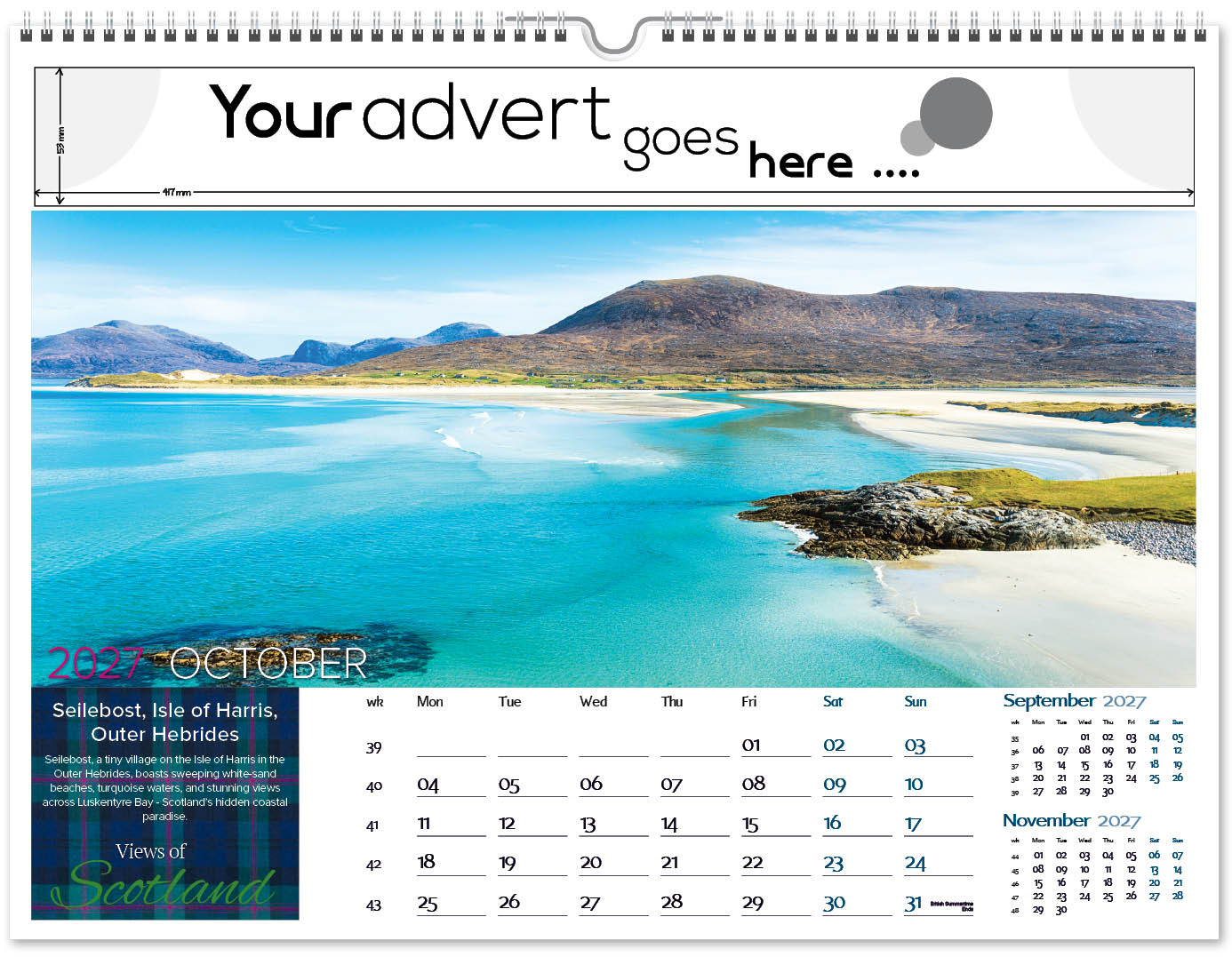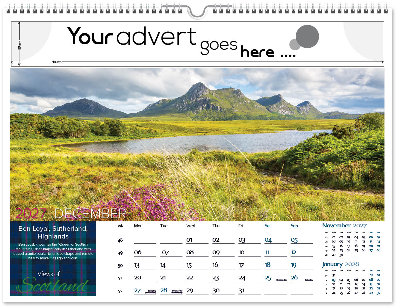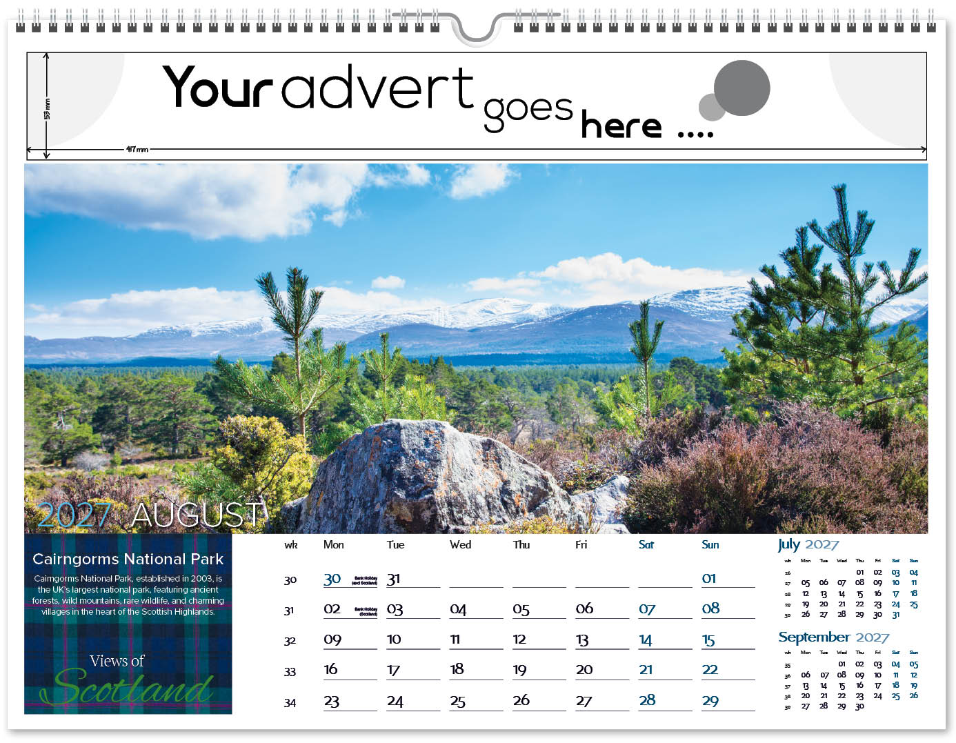 Each calendar comes with an advert section. It is this section that we replace with your personalised company advert that either we design for you, or you supply to us. This section can be seen on our range’s images titled “Your advert goes here”.