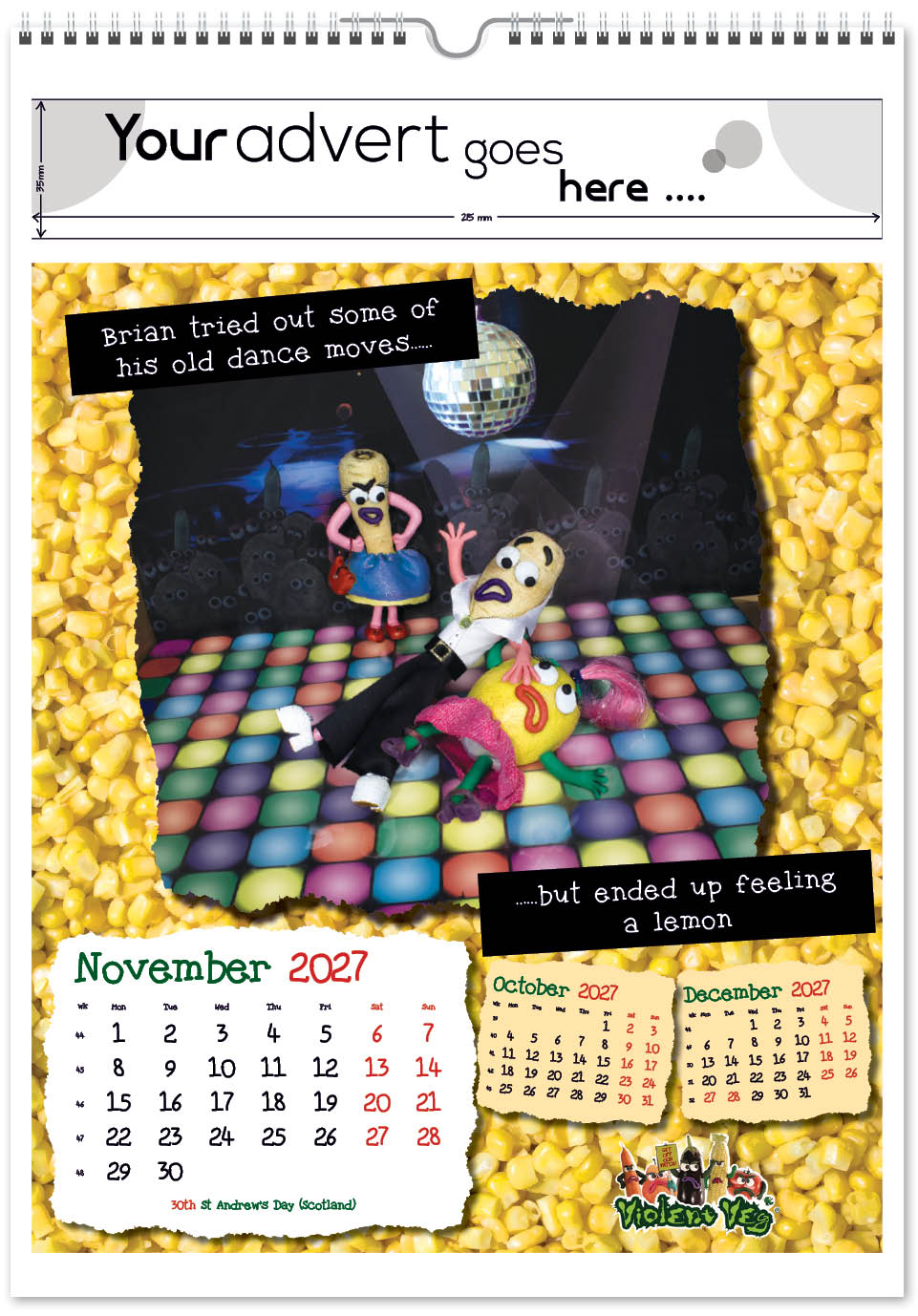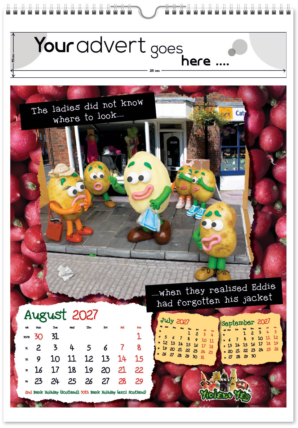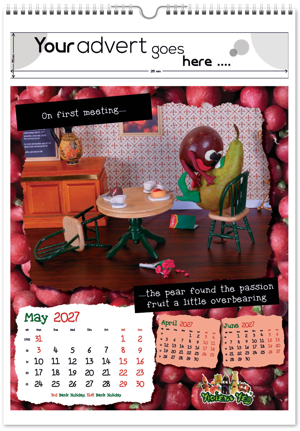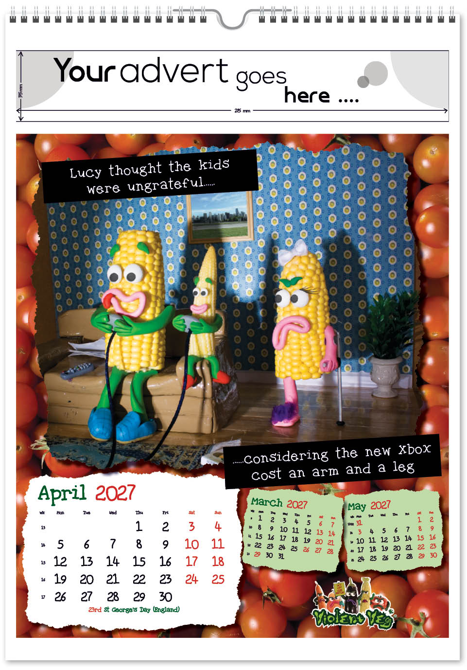 The 13 leaf Violent Veg calendar features vibrant, comical images designed to bring a smile and a chuckle to your day.  All in an economical Royal Mail ‘Large Letter’ size.