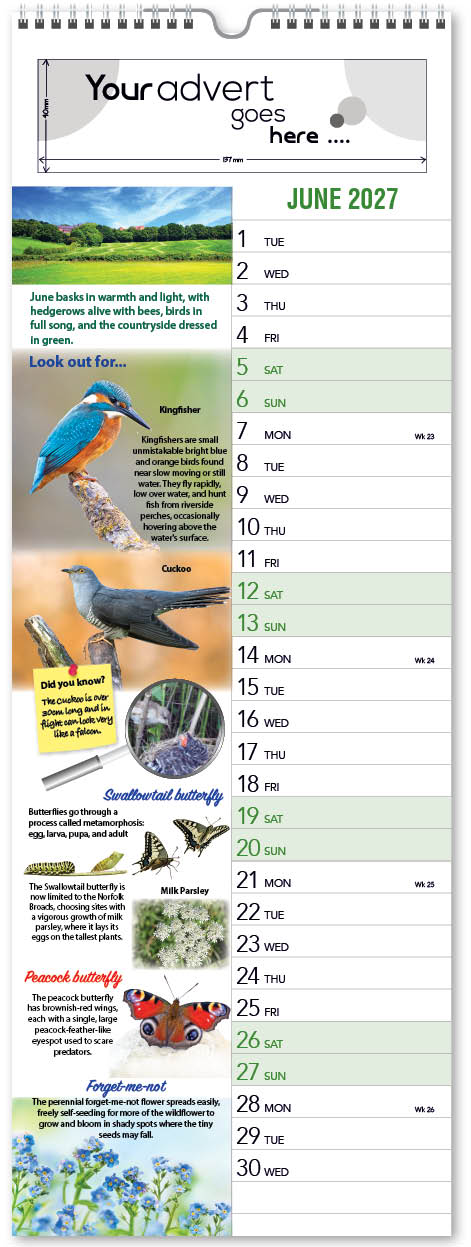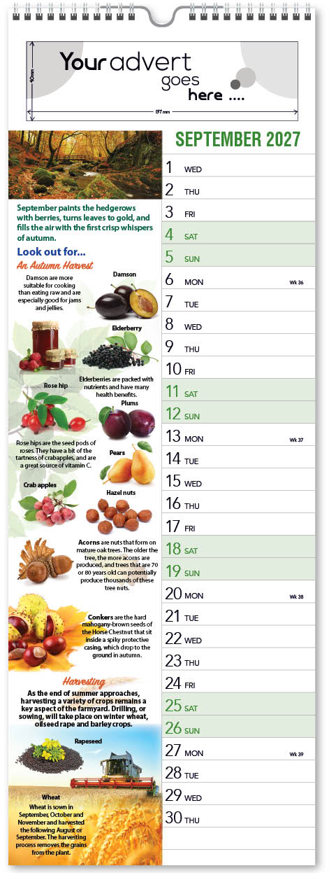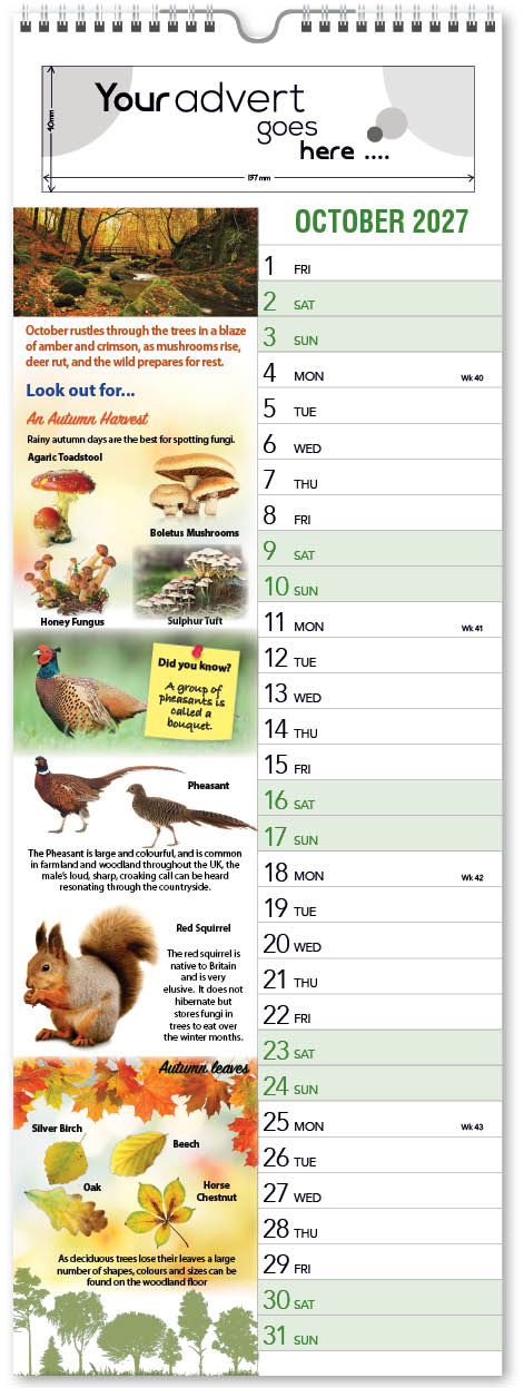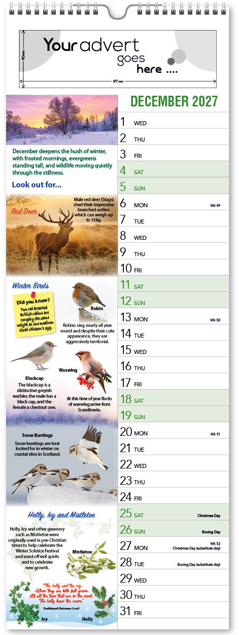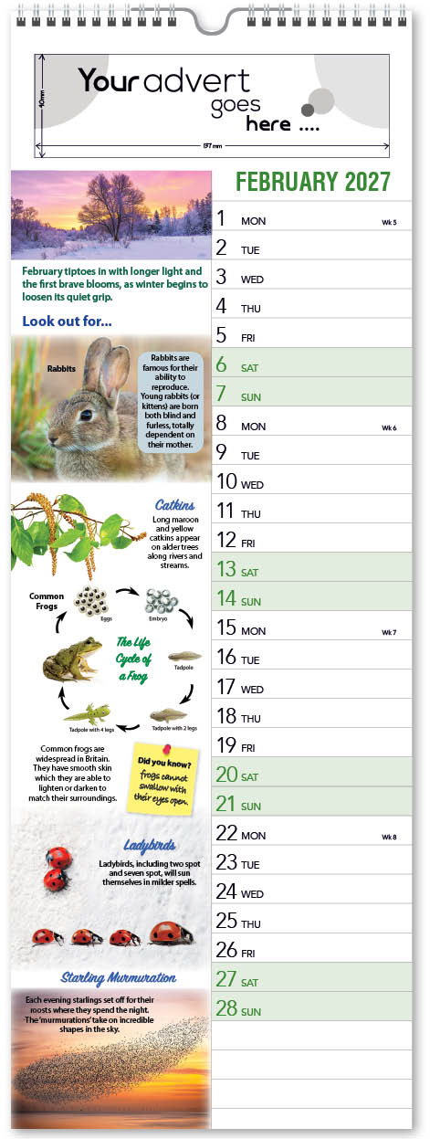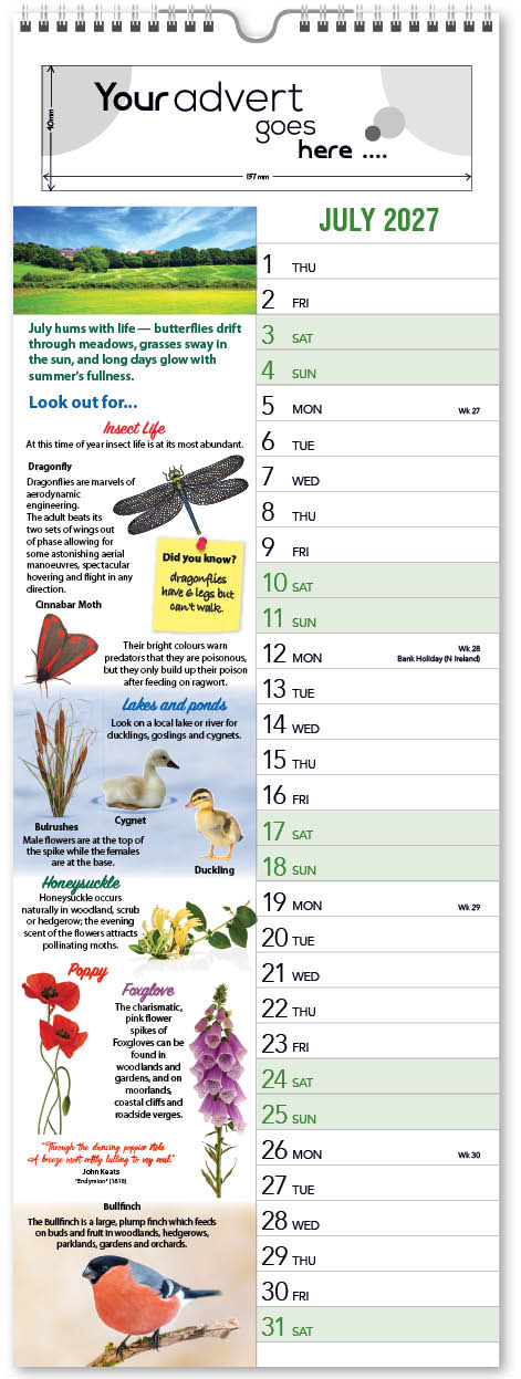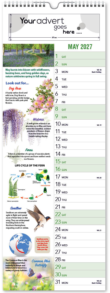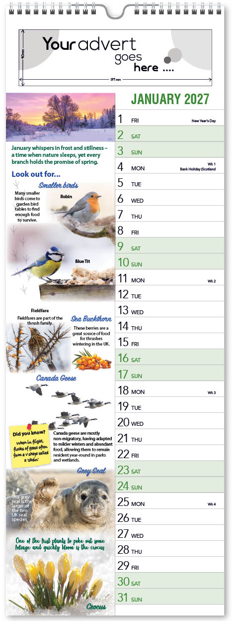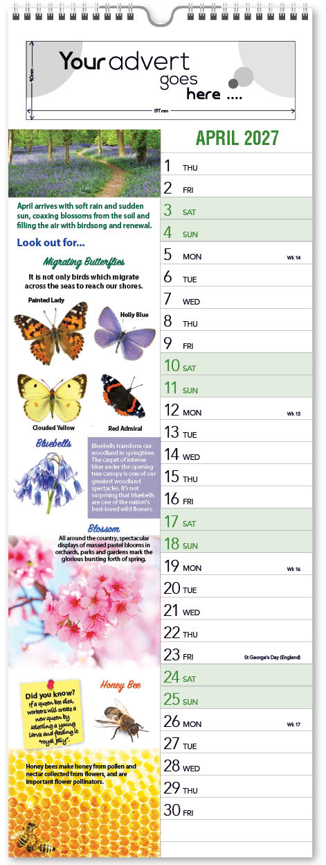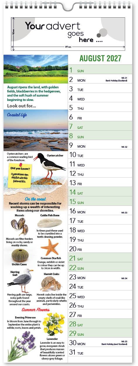 Each calendar comes with an advert section. It is this section that we replace with your personalised company advert that either we design for you, or you supply to us. This section can be seen on our range’s images titled “Your advert goes here”.