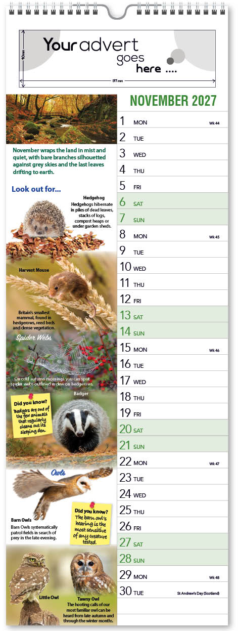 This informative nature calendar features numerous images of birds, animals, plants and flowers on each leaf. A month by month snapshot of our countryside with interesting descriptions and ‘Did you know?’ fun facts.