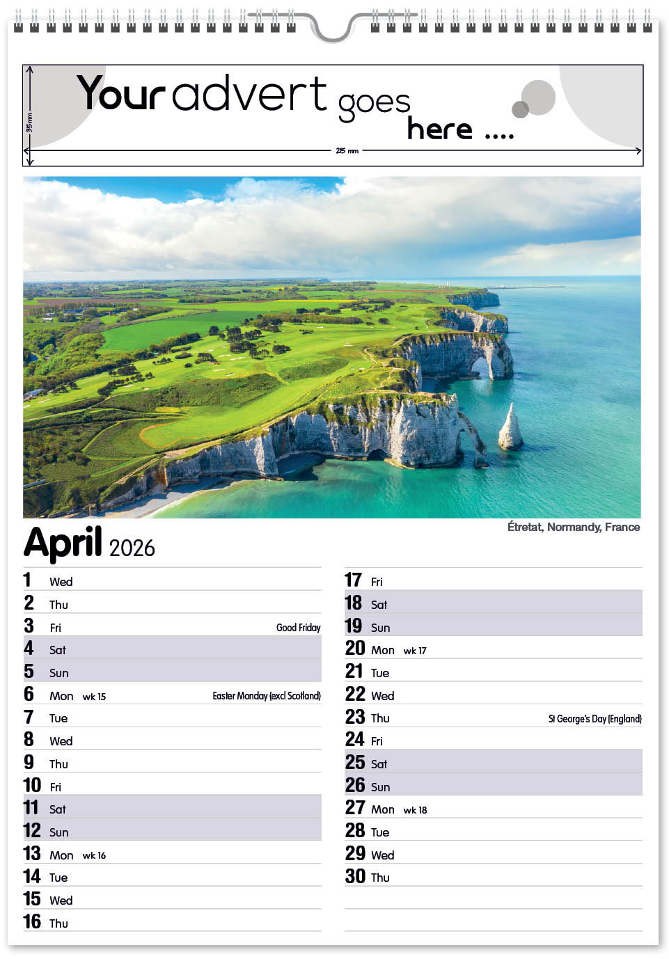 Each calendar comes with an advert section. It is this section that we replace with your personalised company advert that either we design for you, or you supply to us. This section can be seen on our range’s images titled “Your advert goes here”.