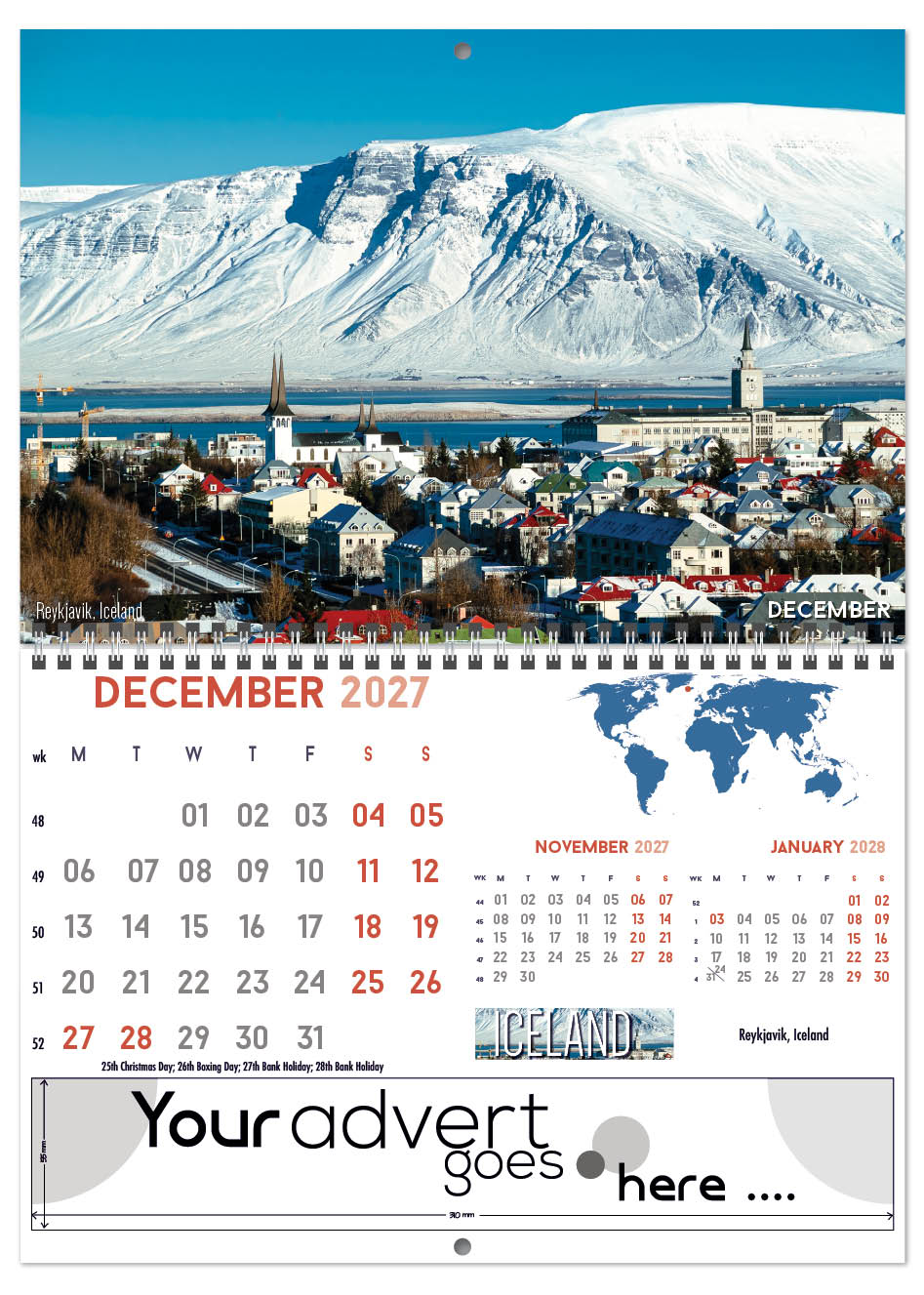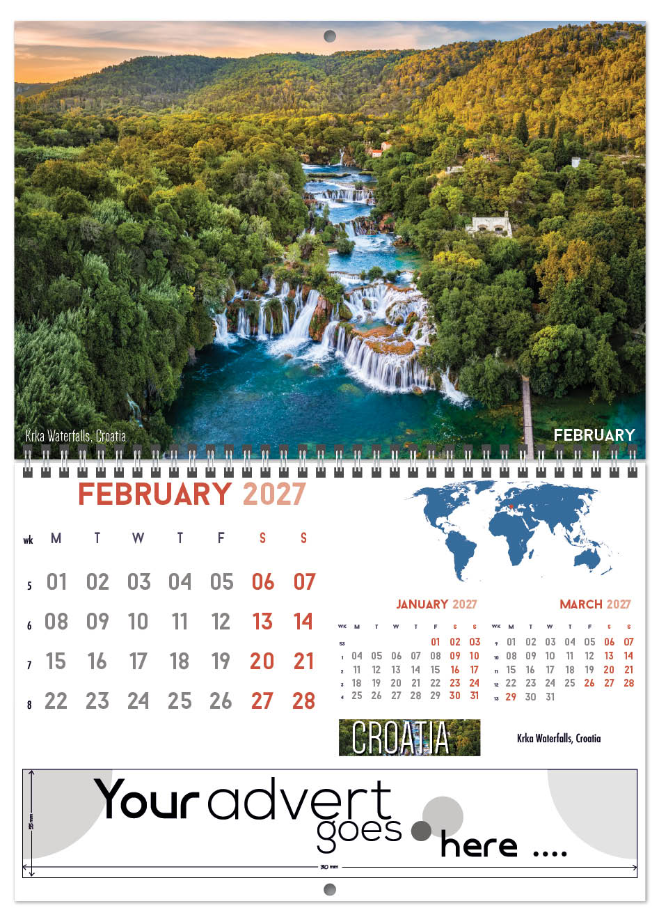 Our Deluxe Central Wiro range of calendars is designed to save you postage whilst still having a premium varnished calendar. When folded they fit into a Royal Mail ‘Large letter’ sized envelope so the saving on postage is substantial. The World Escapes calendar features tantalising images from around the world to encourage your wanderlust. It contains stunning imagery from around the globe, from dramatic cliff-sides to exotic coastal villages. A world map pinpointing the location plus interesting narrative adds to the appeal.