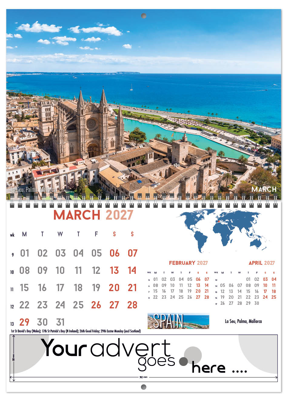 Each calendar comes with an advert section. It is this section that we replace with your personalised company advert that either we design for you, or you supply to us. This section can be seen on our range’s images titled “Your advert goes here”.