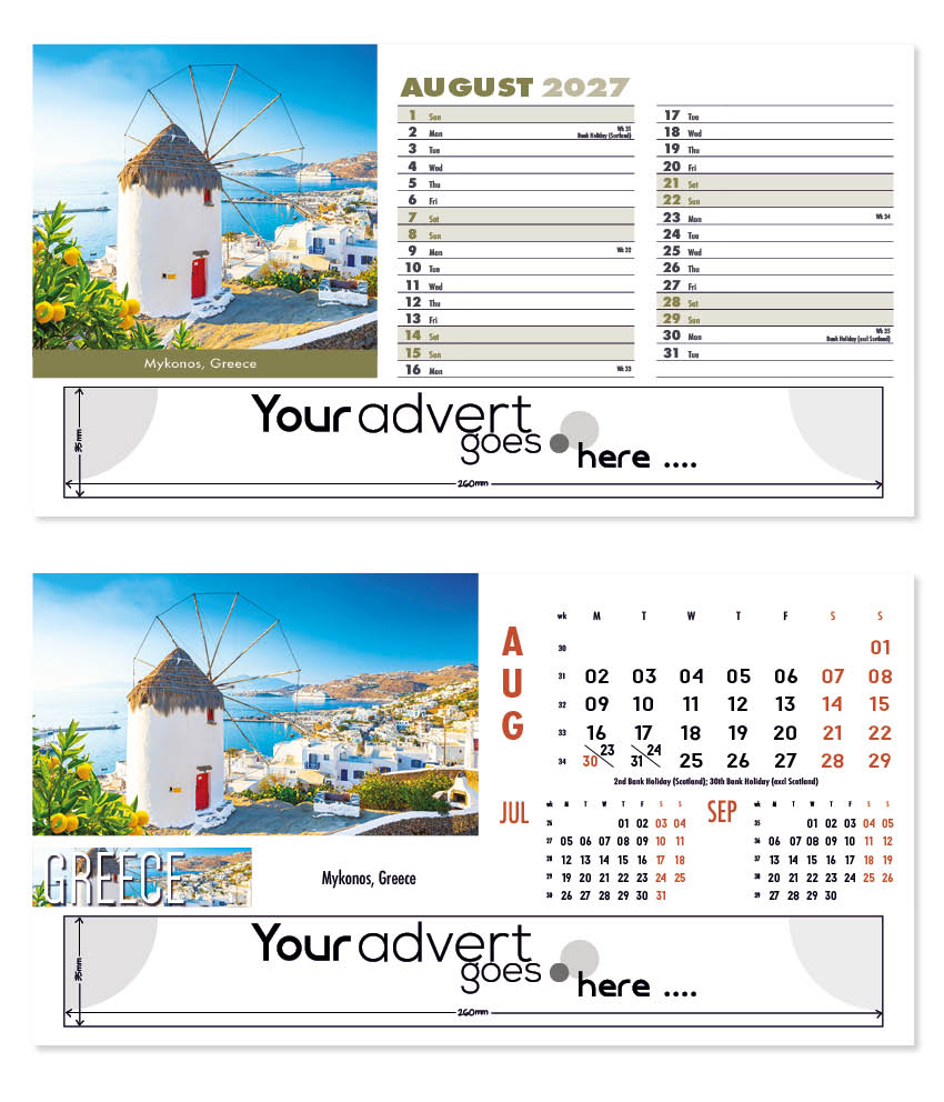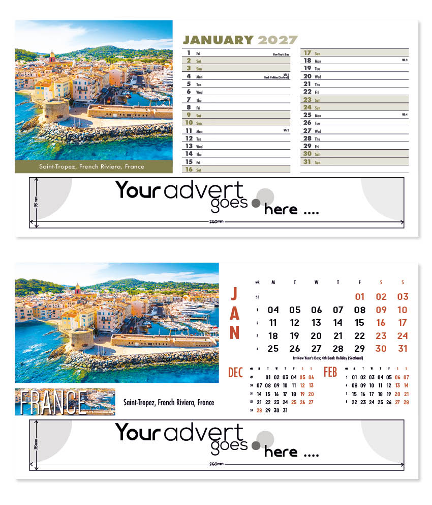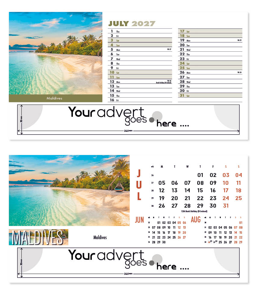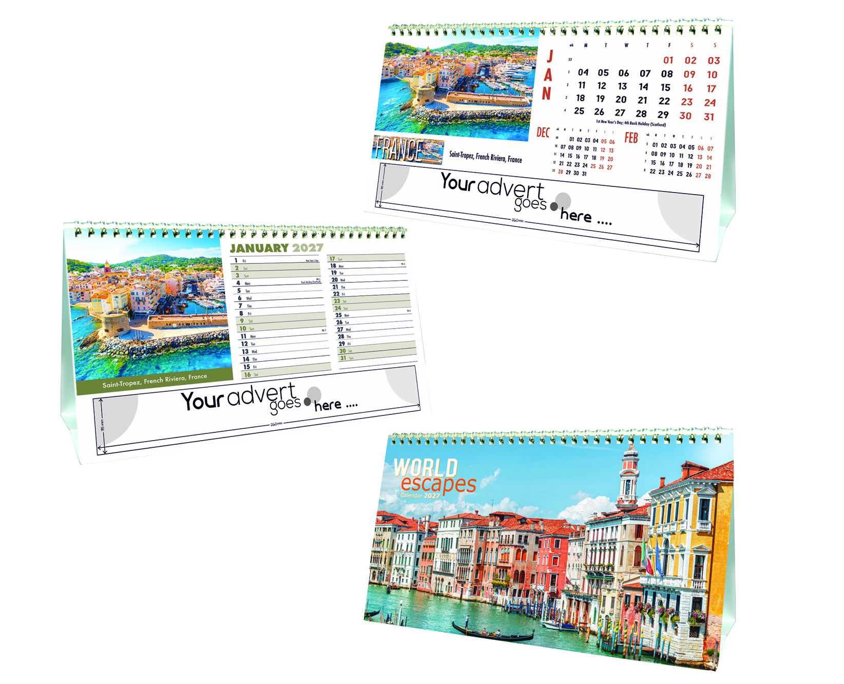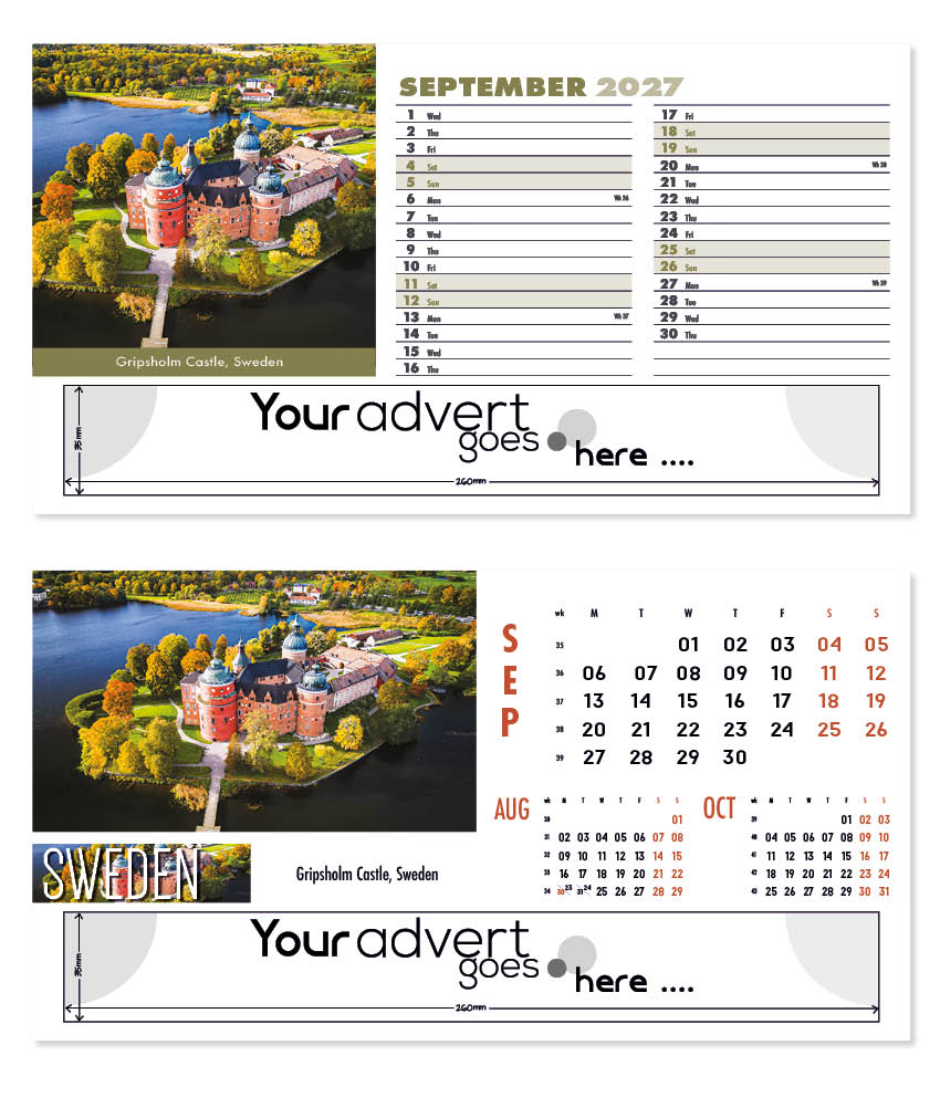 Each calendar comes with an advert section. It is this section that we replace with your personalised company advert that either we design for you, or you supply to us. This section can be seen on our range’s images titled “Your advert goes here”.