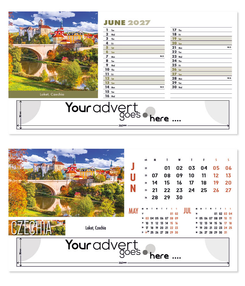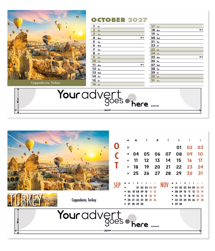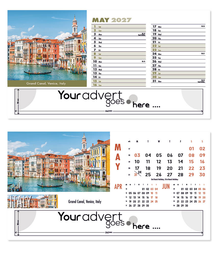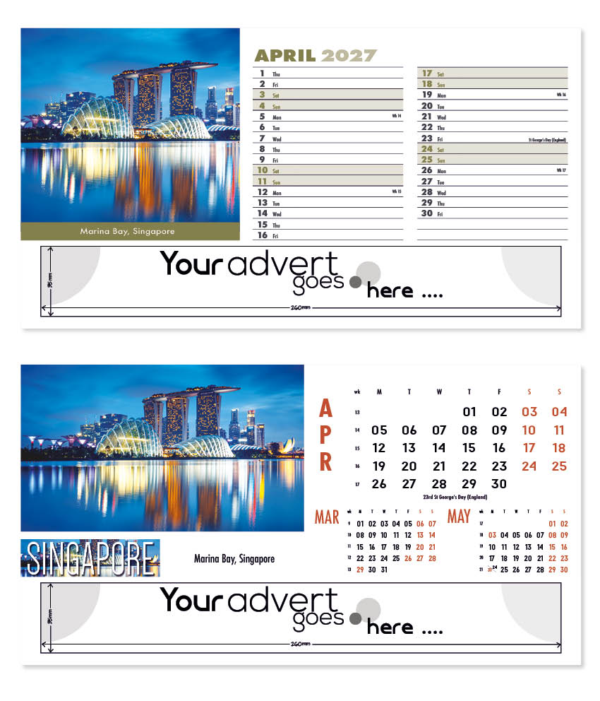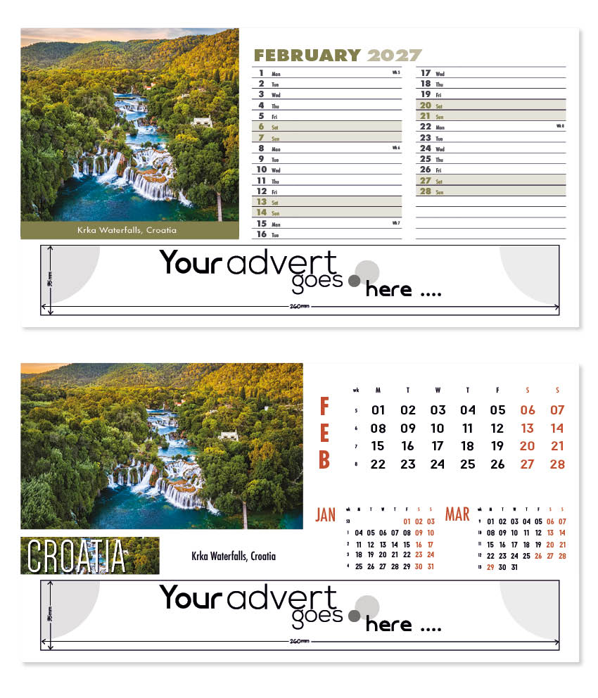 Each calendar comes with an advert section. It is this section that we replace with your personalised company advert that either we design for you, or you supply to us. This section can be seen on our range’s images titled “Your advert goes here”.