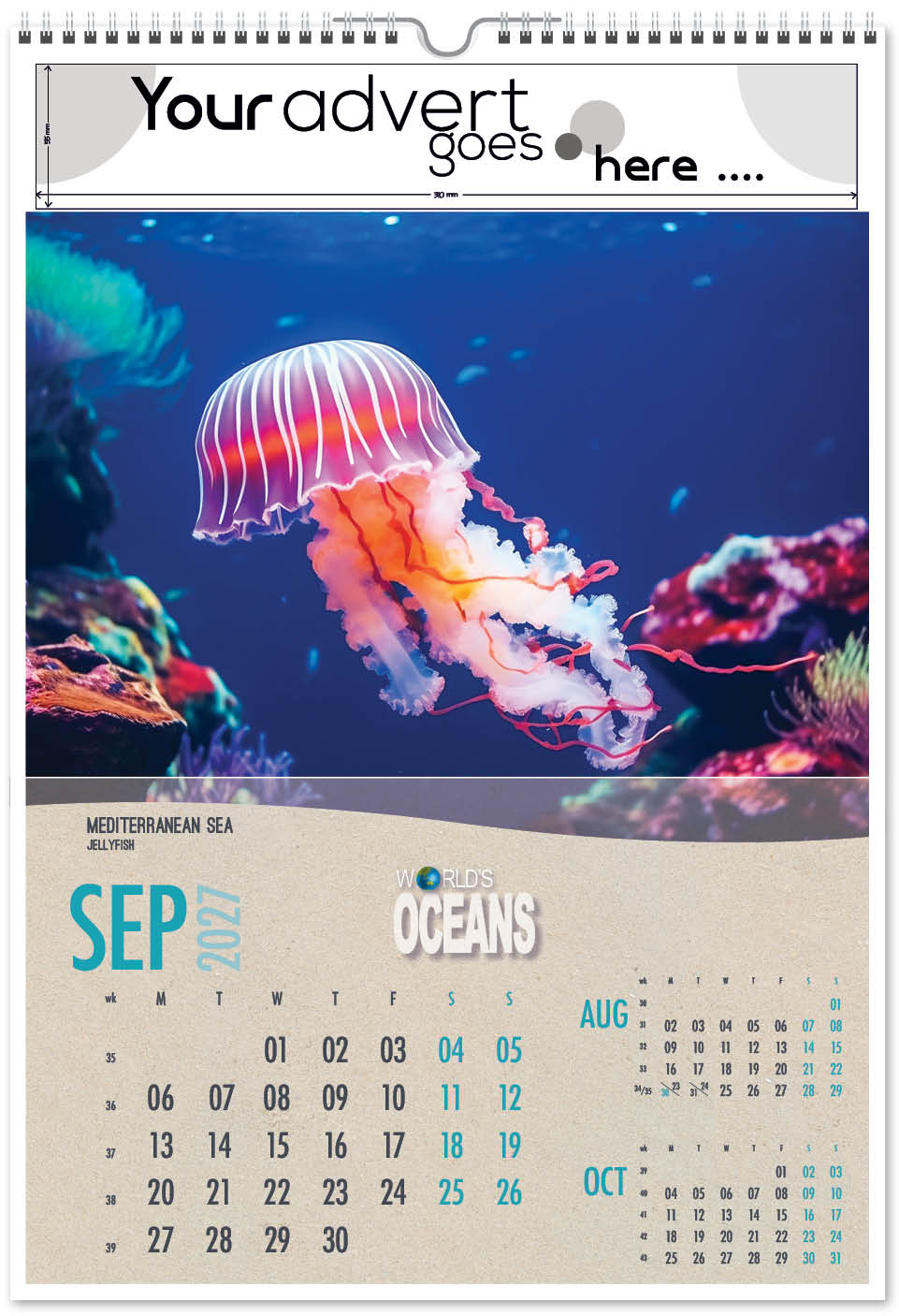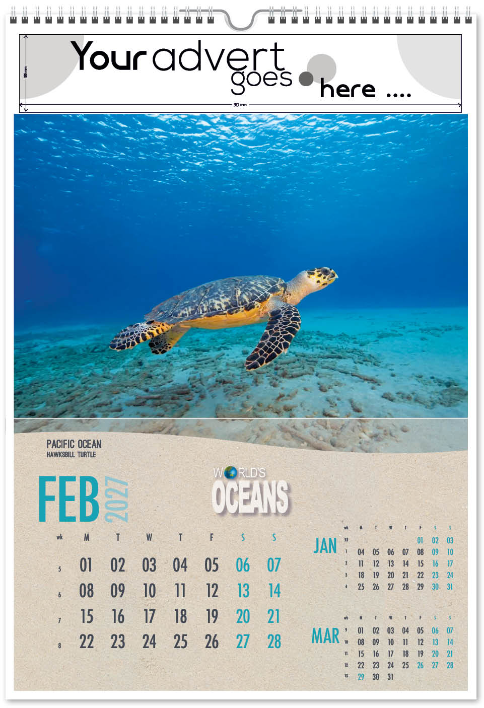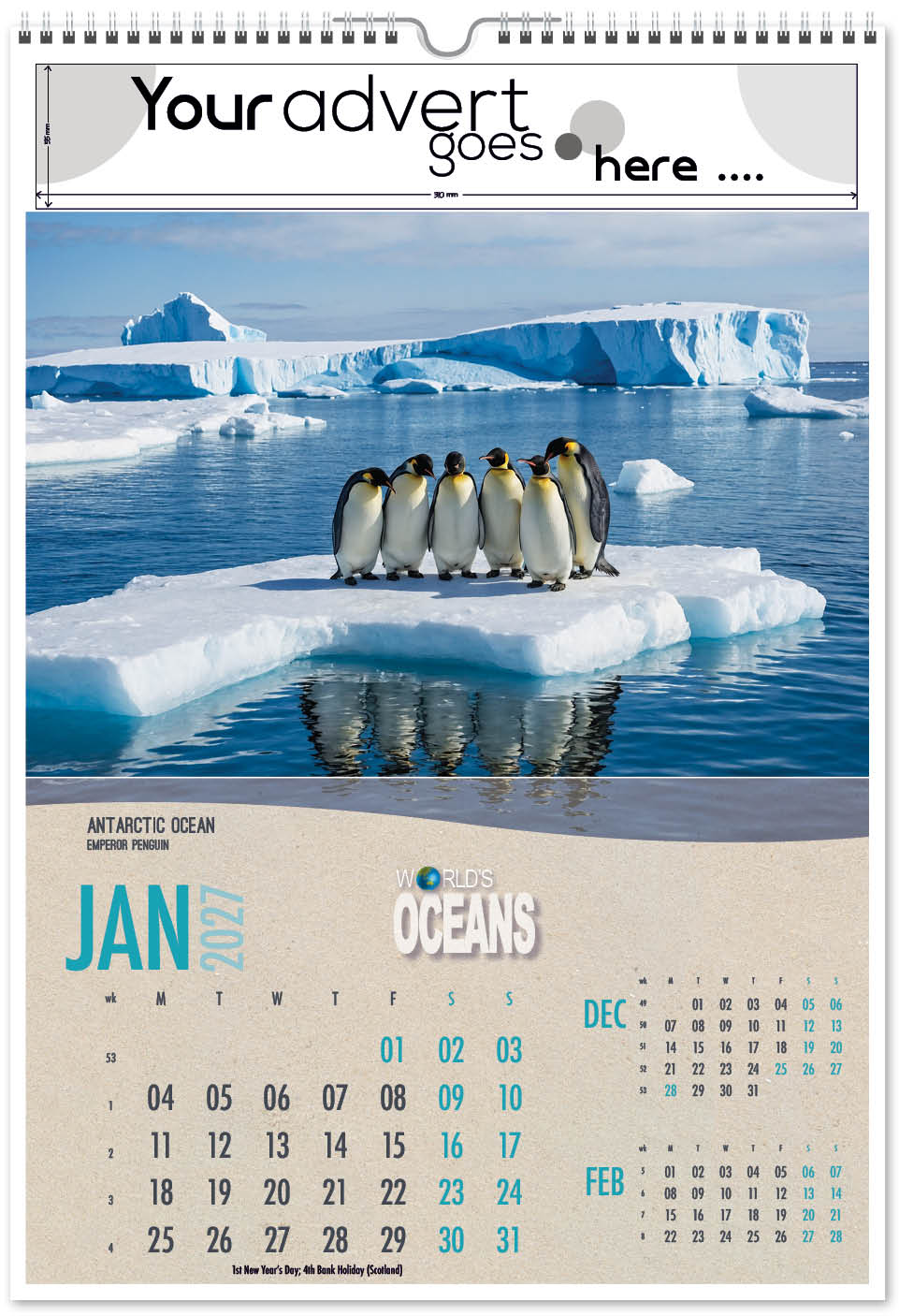 Each calendar comes with an advert section. It is this section that we replace with your personalised company advert that either we design for you, or you supply to us. This section can be seen on our range’s images titled “Your advert goes here”.