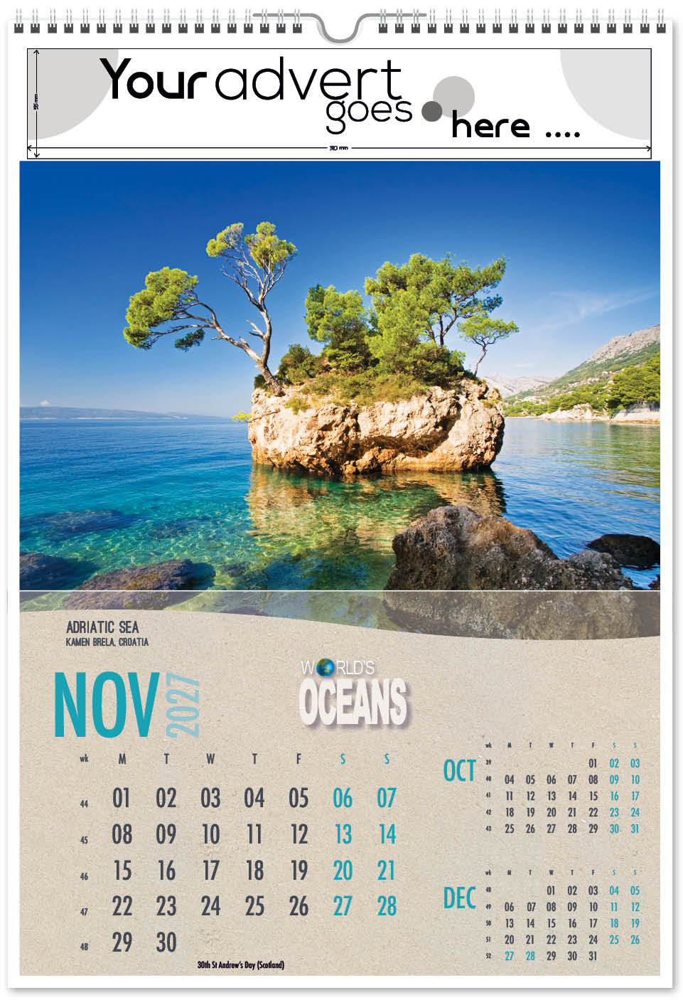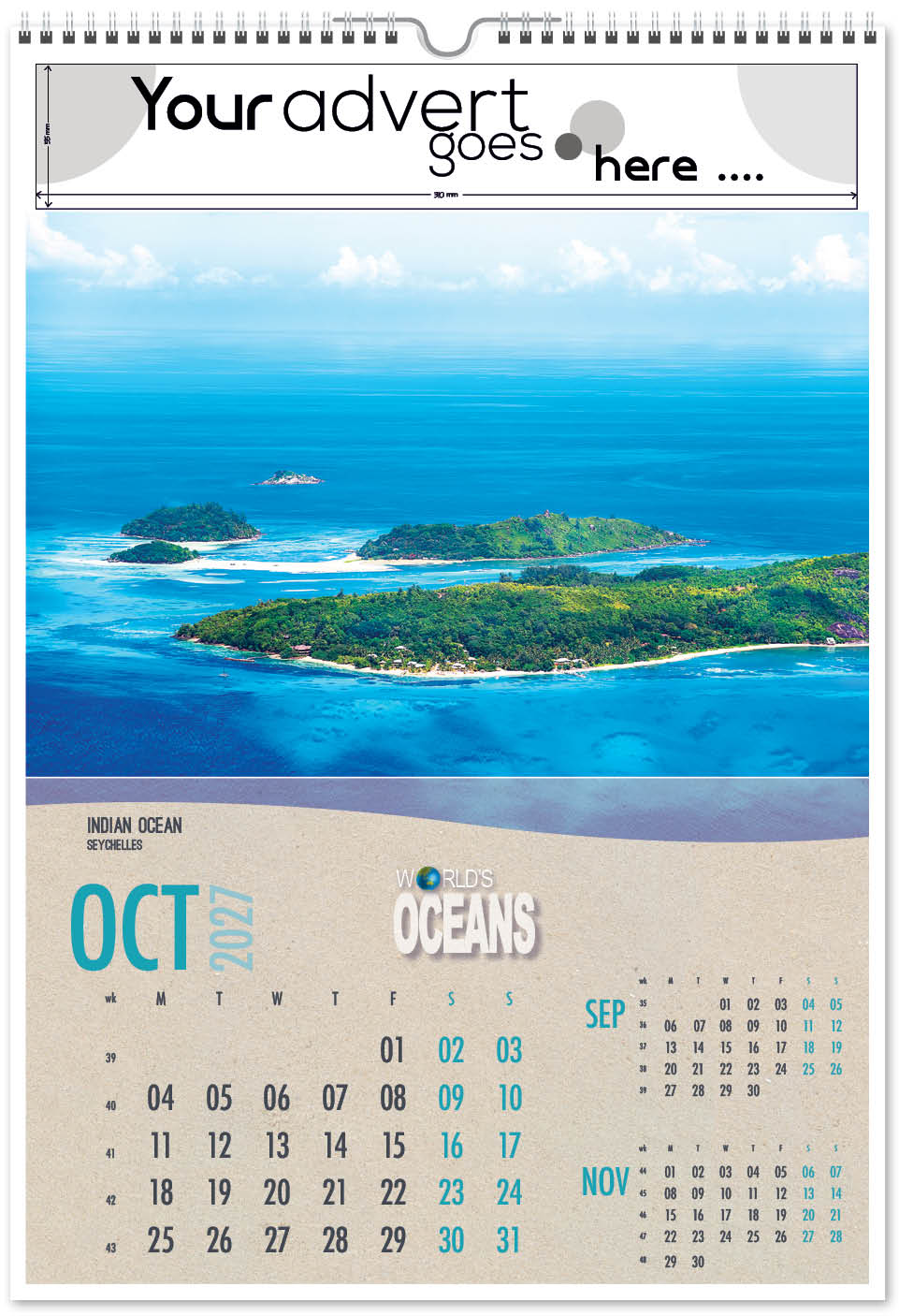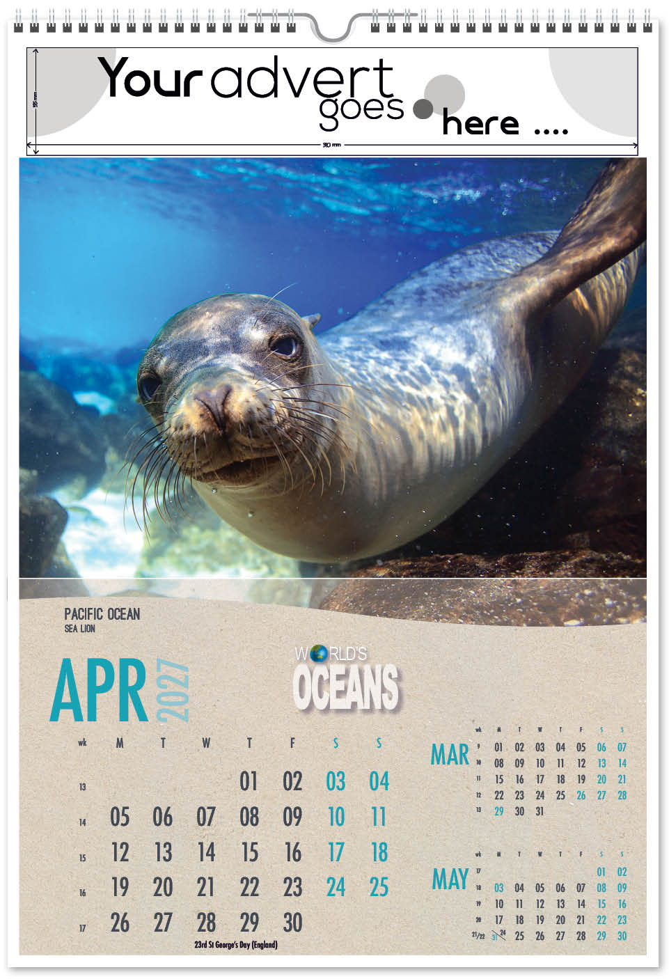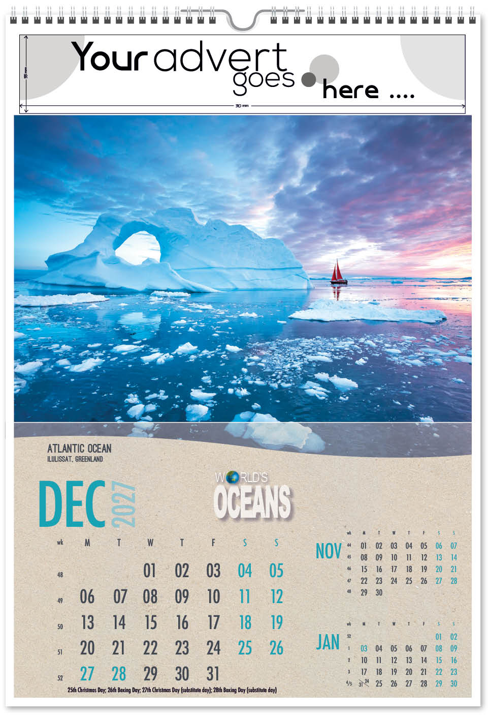 Each calendar comes with an advert section. It is this section that we replace with your personalised company advert that either we design for you, or you supply to us. This section can be seen on our range’s images titled “Your advert goes here”.